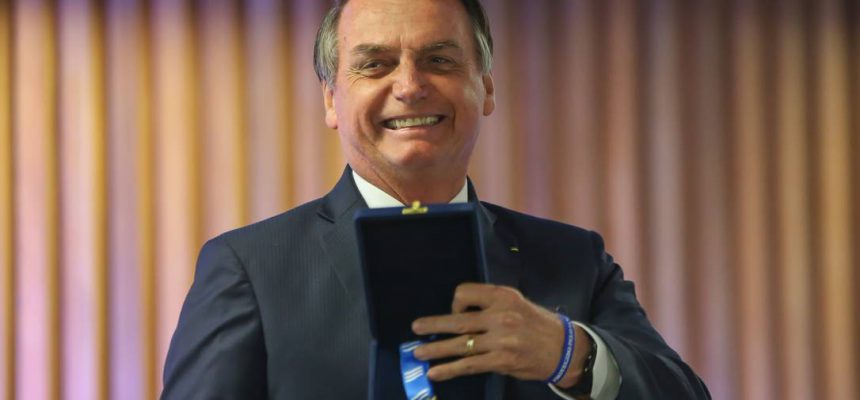Presidente Jair Bolsonaro recebe a medalha de Mérito Legislativo.
