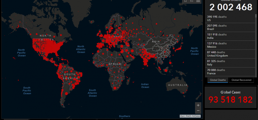 Os dados são da Universidade John Hopkins e somam DOIS MILHÕES 905 vítimas dos Sars-Cov-2, e 93 MILHÕES 400 MIL contaminados.
